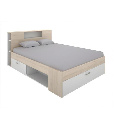 Vente-unique Lit avec tête de lit rangements et tiroirs - 160 x 200 cm - Coloris : Naturel et blanc - LEANDRE
