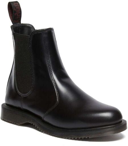 The Flora is a classic Chelsea boots silhouette with a tapered toe shape and touches of unmistakable DM's DNA. The boots is made with black Polished Smooth leather and stands on a low-profile grooved sole with a plain welt for a sleek, minimalist finish. The sides are fitted with an elasticated gusset for easy on, easy off wear. The top of the Chelsea boots is tagged with a black and grey version of our signature heel loop. 70% Leather, 30% Textile. ...