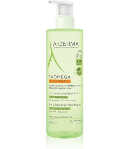 A-Derma Exomega Control 2 in 1 emollient cleansing gel, 500 ml, Gels douche pour enfants pour enfant, Comme la peau des enfants est beaucoup plus sensible et délicate que celle des adultes, il est important de lui offrir des soins particuliers, même en la lavant. Le produit A-Derma Exomega Control Gel Lavant Émollient 2 en 1 maintient la peau délicate de votre enfant, petit ou grand, parfaitement propre, sans l’assécher. Il élimine toutes les impuretés de la peau du visage et du reste du corps sans perturber la barrière cutanée protectrice. Offrez à votre enfant les soins les plus doux et une sensation de confort absolu en le lavant. Le produit : supprime délicatement toutes les impuretés laisse une peau douce et hydratée lave aussi les cheveux Mode d’emploi : Appliquez sur la peau humide et massez délicatement. Rincez ensuite abondamment. ...