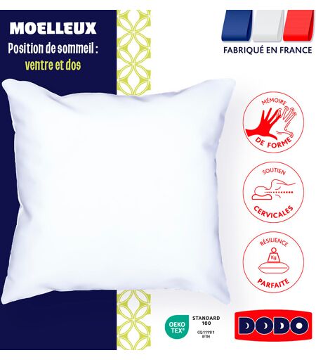 Garnissage d’une microfibre innovante extrêmement fine et courte aux propriétés viscoélastiques qui s’ajuste aux mouvements de la tête et de la nuque.L’élasticité incroyable de la fibre fait disparaitre les points de pression et permet un sommeil vraiment réparateur.Parce qu’il est parfois difficile de choisir entre oreillers classiques et ergonomiques, DODO, propose le compromis idéal. Avec l’oreiller Suprelle Memory, il n’est plus nécessaire de choisir entre tradition et modernité, car avec lui, confort et maintien sont garantis.L’oreiller Suprelle Memory a la particularité d’offrir le confort d’un oreiller familier tout en soulageant la nuque. Parfait pour ceux qui aiment dormir sur le côté, il épouse la forme du cou et lui apporte le soutien dont il a besoin.Un textile intelligent associant 20% de coton, 40% de Tencel et 40% de polyester. La tenue du coton, la souplesse du polyester et l’élasticité du Tencel. Oreiller mœlleux Idéal si vous dormez sur le côté ou sur le ventreBien choisir son oreiller ? Consultez notre guide sur le site.Description Garnissage en microfibre Enveloppe 40% polyester, 40% tencel, 20% cotonEntretien Non déhoussable Non lavableDimensions 40 x 60 cm : bébé 50 x 70 cm : rectangulaire 65 x 65 cm : carré FABRIQUÉ EN FRANCE. OEKO-TEX® Standard 100. La certification OEKO-TEX® Standard 100 contrôle les substances nocives des produits textiles via un label indépendant et international. ...