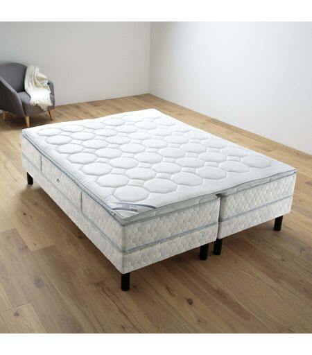 Bénéficiez du savoir-faire inégalé de la literie des hôtels de luxe !L'ensemble de standing surmatelas + matelas ressorts + sommiers tapissiers vous propose le plaisir d'une expérience unique : une nouvelle façon de se reposer, une vraie sensation de confort.MATELAS RESSORTS BICONIQUES Confort d’accueil : moelleux Fermeté : ferme Type de matelas : ressorts ensachés, 3 zones de confort différenciées Le + : bonne aération, indépendance de couchageBien choisir sa literie ? Consultez notre guide sur le site.Description Mono face : 15mm de mousse polyéther (16kg/m³) + 300g/m² ouate de polyester + 15g/m² de voile de polyester Plate-bande piquée sur 8 mm de mousse polyéther (16kg/m³) + voile de polyester (15g/m²). 2 x 2 poignées de transport facilitant également le retournement du matelas. 2 aérateurs. Description Dimensions Hauteur : 23 cmSOMMIER À LATTES RECOUVERTES Type de sommier : tapissier à lattes Fermeté : médium Le + : lattes recouvertes, empêche le matelas de glisserDescription Caisse en pin massif. Masse d'angles avec insert pour recevoir les pieds tige filetée Ø 8 mm. Suspension 2 x 14 lattes multiplis de bouleau et peuplier (en 140 x 190) vernies insérées dans embouts. Toile de fond anti-poussière. Coutil 100% polyester. 8 Pieds vernis coloris naturel livrés. à noter que pour toutes les dimensions vous recevez, 2 sommiers, 2 matelas et 1 surmatelas. Dimensions Hauteur : 14 cmSURMATELAS MOUSSE DE CONFORTLes avantages du surmatelas :l'alliance idéale entre confort, accueil et douceur. D'une épaisseur de 5 centimètres, le surmatelas vous offre un accueil moelleux.DescriptionDescription Piqué sur mousse polyéther 18 mm et ouate de polyester 300 g/m². fermeture à glissière assurant le parfait maintien en place sur le matelas.Dimensions Hauteur : 5 cmQualité Garantie 5 ans FABRIQUÉ EN FRANCE. FABRICATION À LA DEMANDE. En ne produisant que l’article commandé, les ressources sont préservées. Pas de surproduction, pas de matières premières utilisées inutilement. ...