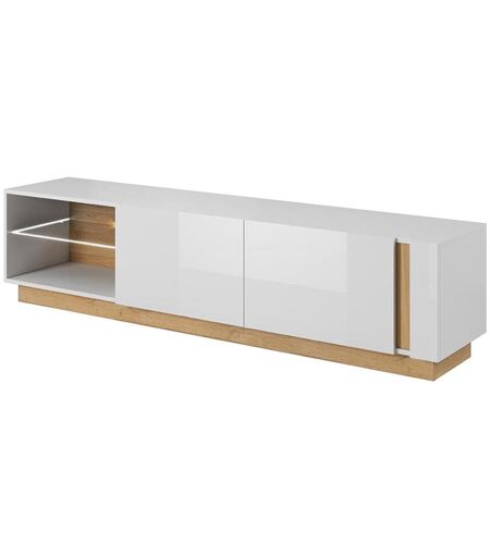 Meuble TV MURARI - 2 portes et 2 niches - Avec LEDs - Structure : Panneaux particules et verre - Coloris : Blanc brillant et chêne - Style : Contemporain - Dimensions : L187,5 x P40 x H45,5 cm - Plongez dans une ambiance moderne avec la collection MURARI ...