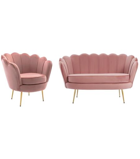 Ensemble canapé 2 places et fauteuil coquillage en velours rose - De style art déco aux lignes arrondies et élégantes avec pieds en métal doré DANDELION ...
