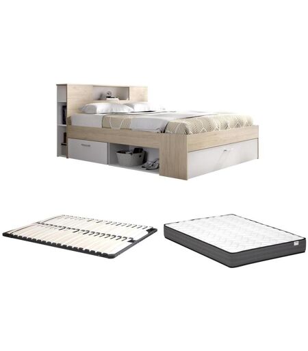 Vente-unique Lit avec tête de lit rangements et tiroirs - 160 x 200 cm - Coloris : Naturel et blanc + Sommier + Matelas - LEANDRE