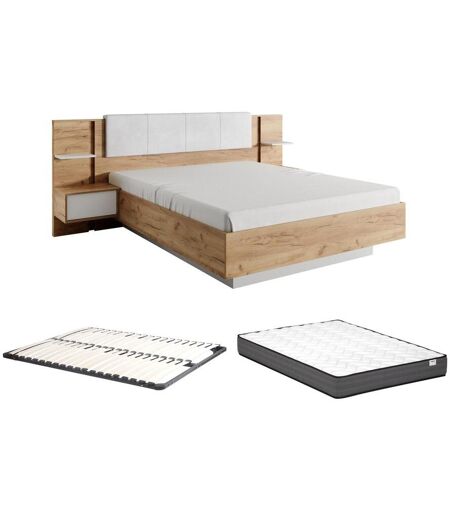 Vente-unique Lit avec chevets 160 x 200 cm - Avec LEDs - Coloris : Naturel et blanc + Sommier + Matelas - ELYNIA