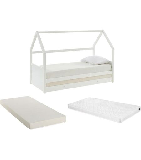 Vente-unique Lit gigogne cabane 2 x 90 x 190 cm - Pin - Blanc + Matelas - HURRA