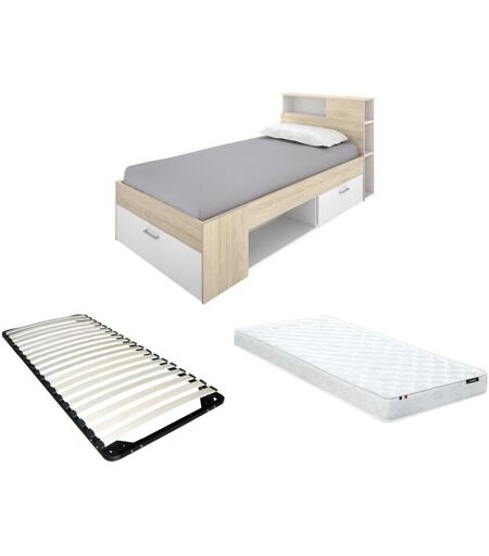Vente-unique Lit avec tête de lit rangements et tiroir - 90 x 190 cm - Blanc et Naturel + matelas + sommier - LEANDRE