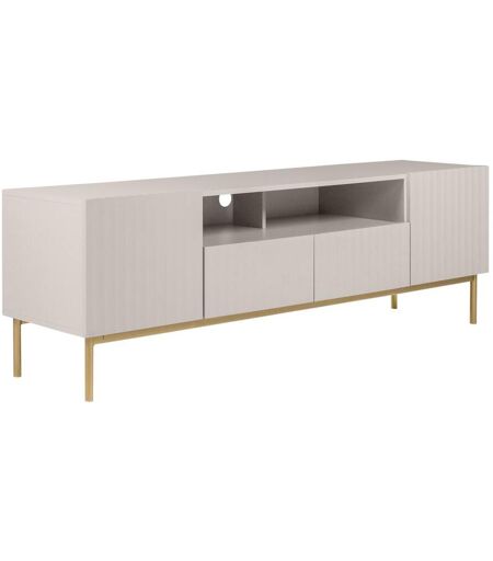 Meuble TV EVILANA avec 2 portes, 2 tiroirs et 2 niches - Matières : MDF, panneau de particules et acier - Coloris : Beige et doré - Style : Art déco - Dimensions : L190 x P45 x H60,6 cm - Optez pour EVILANA : un meuble TV élégant aux lignes soignées ...