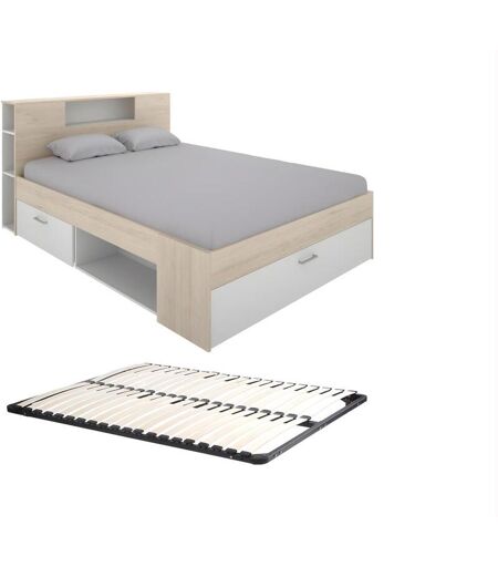 Vente-unique Lit avec tête de lit rangements et tiroirs - 160 x 200 cm - Coloris : Naturel et blanc + Sommier - LEANDRE