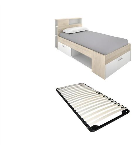 Vente-unique Lit avec tête de lit rangements et tiroir - 90 x 190 cm - Blanc et Naturel + Sommier - LEANDRE