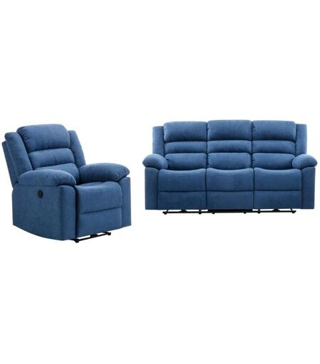 Canapé 3 places et fauteuil relaxation électrique en tissu bleu. De style classique intemporel avec un effet surpiqué et option dossier inclinable. BUROLO ...