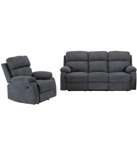 Canapé et fauteuil relax manuel en tissu anthracite TOLZANO. Dim 1pl : L91 x P96 x H100 cm. Dim 3pl : L201 x P96 x H100 cm. Tissu 100% polyester. Pieds métal. ...