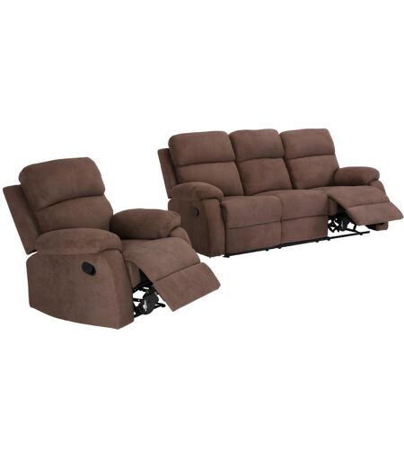 Canapé et fauteuil relax manuel en tissu marron TOLZANO. Dim 1pl : L91 x P96 x H100 cm. Dim 3pl : L201 x P96 x H100 cm. Tissu 100% polyester. Pieds métal. ...