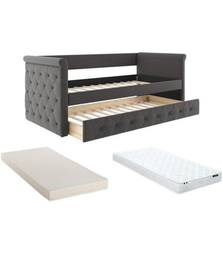 Lit banquette gigogne LOUISE - 2x90x190cm - Tissu gris capitonné - Avec matelas. Dimensions : L219 x P98.5 x H95.2cm. Style : charme scandinave. ...