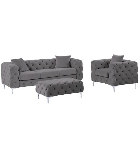 Canapé 3 places, fauteuil et pouf chesterfield en velours anthracite et pieds en métal. Style charme vintage avec effet capitonné. Douceur du velours. EDWINA ...