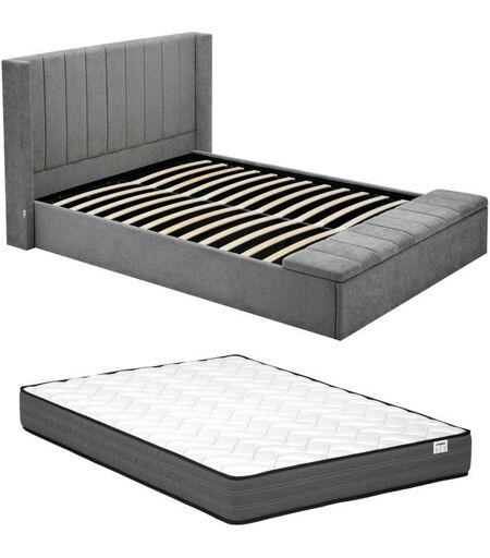 Lit coffre 140 x 190 cm avec banc - Structure : MDF et contreplaqué - Revêtement : Tissu - Coloris : Gris - Dimensions : L162 x P235.5 x H120 cm - Style : Classique intemporel + Matelas - Apportez chic et praticité avec le lit coffre DOUINO ! ...