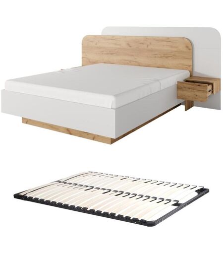 Lit avec chevets 160 x 200 cm - 2 tiroirs et LEDs - Structure : Panneaux de particules - Coloris : Naturel et blanc - Style : Contemporain - Dimensions : L245,5 x P208,8 x H115,6 cm + Sommier - Optez pour un lit pratique et déco avec DESADO ! ...