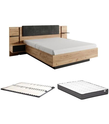 Vente-unique Lit avec chevets 140 x 190 cm - Avec LEDs - Coloris : Naturel et anthracite + Sommier + Matelas - ELYNIA