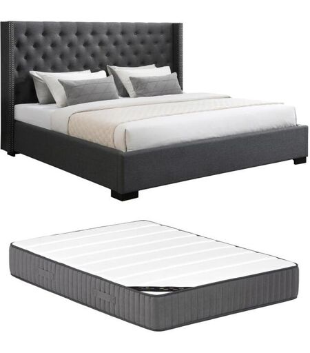 Vente-unique Lit 200 x 200 cm avec tête de lit capitonnée - Tissu - Gris + Matelas - MASSIMO