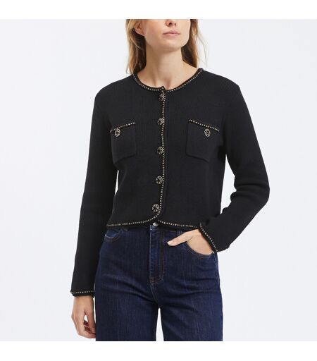 Le cardigan court col rond pour femme SUNCOO - modèle GARVI. Belle tenue par une maille côtelée pour ce cardigan boutonné aux détails de style esprit couture : poches poitrine, bords gansés et boutons fantaisie. La coupe est impeccable.Détails produit Cardigan col rond Manches longues Fermeture boutonnéeComposition et Entretien 55% polyamide, 20% polyester, 16% acrylique, 9% laine Pour l'entretien, merci de vous référer aux indications figurant sur l'étiquette du produit ...