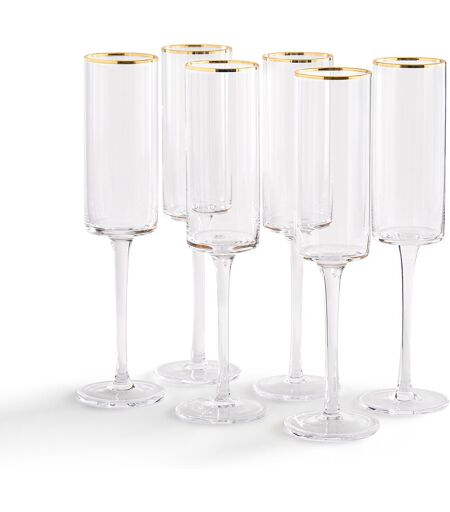 Complices des jolies tables, ces 6 flûtes à champagne au design cubique sont délicatement soulignées d’un liseré doré. A vous les soirées entre amis !Description En verre souligné d'un liseré doré Vendues par lot de 6Dimensions Diamètre : 5 cm Hauteur : 24 cm Contenance : 20 clEntretien Incompatibles lave-vaisselle et micro-ondes.Notre vaisselle est expédiée dans un emballage spécifiquement conçu pour éviter tout risque de casse. ...