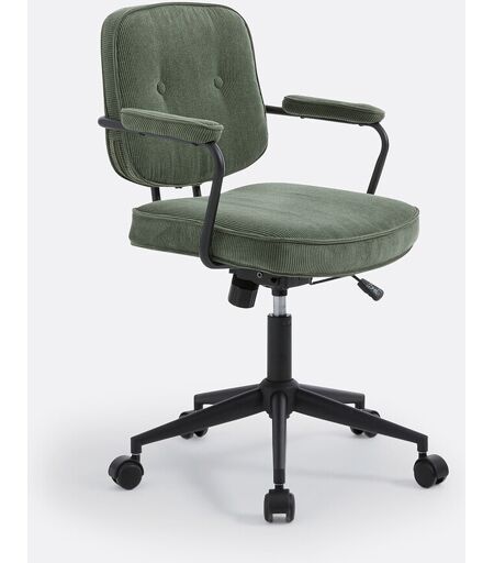 Un design épuré et un revêtement en velours côtelé, voici le fauteuil Felipe. Son assise pivotante et ses 5 roues multidirectionnelles en font un élément à la fois pratique et esthétique.Description Assise rotative et réglable en hauteur. Fonctions lift et tilt : permet de régler la hauteur et l'inclinaison souhaitées. Revêtement tissu velours côtelé 92% polyester et 8% nylon, 335 g/m2. Dossier, assise et accoudoirs rembourrés, garnissage mousse polyuréthane, densité 28 kg/m3 (assise) et 24 kg/m3 (dossier). Structure en acier et contreplaqué en bois de peuplier. Bois certifiés FSC® Mixte Piètement en acier finition époxy avec 5 roulettes en nylon.DimensionsTotales Largeur : 65 cm Hauteur : 85/95 cm Profondeur : 64 cm Poids : 10,9 kgAssise L46 x H48,5/58 x P41 cm Hauteur accoudoirs : 67/77 cm Ce produit est vendu à monter soi-même. BOIS ISSU DE FORÊTS GÉRÉES PLUS DURABLEMENT ET DE SOURCES CONTRÔLÉES. Le bois FSC® Mixte contient au minimum 70% de bois certifié FSC® et/ou recyclé, le reste étant du bois contrôlé FSC®.Dimensions et poids du colis 1 colis L67 x H65 x P32 cm. 13 kg ...