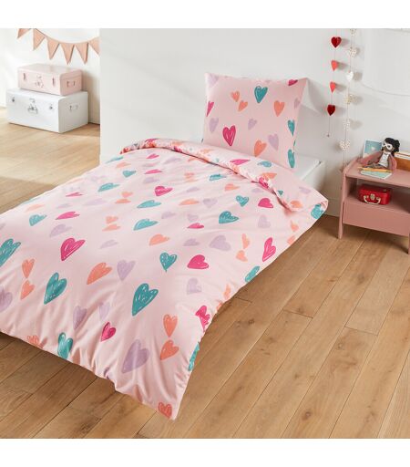 Pluie de cœurs multicolores sur fond uni. Pur coton ultra doux et confortable. La parure de lit en coton Sweetheart comprend la housse de couette et sa taie assortie.Description 100% coton 57 fils/cm² Recto/verso imprimé cœurs Rabat au piedEntretien Température de lavage 60° En lavant votre linge à 40° au lieu de 60°, vous limitez la consommation d'énergieDimensions Housse de couette 140 x 200 cm + 1 taie d’oreiller 63 x 63 cm : 1 personne OEKO-TEX® Standard 100. La certification OEKO-TEX® Standard 100 contrôle les substances nocives des produits textiles via un label indépendant et international. ...