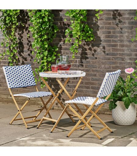Composé d'une table ronde et de deux chaises 100% pliables, le set de jardin Lyme est parfait pour les petits balcon ou loggia...Description Structure en fer teinté marron clair finition époxy Assise, dossier et plateau de la table revêtus de résine tressée plate en polyester coloris blanc et bleu Poids maxi supporté 120 kgDimensionsTable Ø58 x H71 cm Épaisseur plateau : 3,5 cmChaise Largeur : 56 cm hauteur : 78 cm Profondeur : 46 cm Assise : L41,5 x H42 x P38 cm Ce produit est vendu monté.Dimensions et poids du colis 1 colis L157 x H18 x P157 cm, 82,5 kg ...