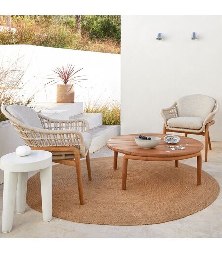 Plateau convivial grand format, pieds courbes et souples... la table basse Irati est fabriquée en teck massif, une essence de bois adaptée à la vie en plein air. Une création exclusive des designers AMPM.Description Plateau en teck massif FSC® Piètement en teck massif FSC®QualitéLe teck massif est, par excellence, l'essence de bois adaptée à l'extérieur. Il est imprégné d'une huile qui lui assure sa durabilité et résistance face aux intempéries et aux agressions d'insectes et de champignons.Entretien Les températures basses sont susceptibles d'altérer le bon fonctionnement et l’état de surface de votre mobilier d’extérieur. Nous vous conseillons donc de le remiser dans un local sec, aéré et clos. Nous déconseillons fortement l'utilisation d'une bâche, car elle jouera le rôle d’étuve et abimera les états de surface ; les produits bois et métal sont particulièrement concernés. Avant tout remisage, pensez à bien nettoyer et sécher les produits, afin de prévenir l'apparition de moisissures ou d'odeurs désagréables. Il est en tous les cas et quel que soit le matériau déconseillé de laisser le mobilier à l’extérieur sans protections, particulièrement pendant les intempéries et la phase hivernale.Dimensions Diamètre : 100 cm Hauteur : 34 cmLivraisonCe produit est vendu monté. Il sera livré chez vous sur rendez-vous.Attention ! Veuillez vérifier que les ouvertures (portes, escaliers, ascenseurs) permettront le passage du colis lors de la livraison. BOIS ISSU DE FORÊTS GÉRÉES PLUS DURABLEMENT. Le bois certifié FSC® est issu de forêts bien gérées sur le plan environnemental, social et économique.Dimensions et poids du colis1 colis L105 x H41 x P105 cm, 21 kg ...