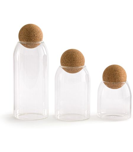 L'indispensable bocal en verre se renouvelle avec un bouchon en liège forme boule : original et design. Placés côte à côte, ces 3 bocaux forment un ensemble aussi décoratif que pratique.Description En verre Bouchon forme boule en liège Vendus par lot de 3 tailles différentesEntretien Incompatible micro-onde et compatible lave-vaisselleDimensionsPetit modèle Diamètre 9 cm Hauteur 13,5 cm Contenance 450 mlMoyen modèle Diamètre 9 cm Hauteur 17,5 cm Contenance 650 mlGrand modèle Diamètre 9 cm Hauteur 23,3 cm Contenance 1030 mlNotre vaisselle est expédiée dans un emballage spécialement conçu pour éviter tout risque de casse. ...