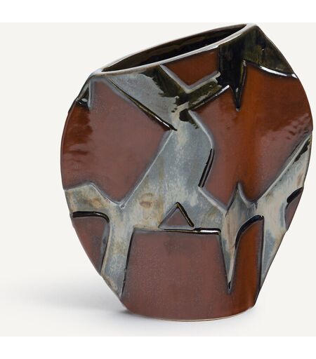 Sous tous les angles, ce vase révèle sa singularité. Sa forme atypique créée par les lignes continues de son design est valorisée par son grès émaillé métallisé appliqué artisanalement.Une technique artisanale qui fait vibrer les couleurs, du brun le plus profond à l’argent le plus vif.Description Céramique émaillée, émail métallisé appliqué à main Fabrication artisanale, chaque pièce est unique. Les formes, couleurs et dimensions peuvent légèrement varier d'un produit à l'autreEntretienLa céramique est une matière solide face aux chocs, aux rayures et aux tâches. Elle se nettoie à l'aide d'une éponge humideDimensions Largeur : 23 cm Hauteur : 26 cm Profondeur : 8 cmDimensions et poids du colis1 colis L32 x H35 x P17 cm, 1,9 kg ...