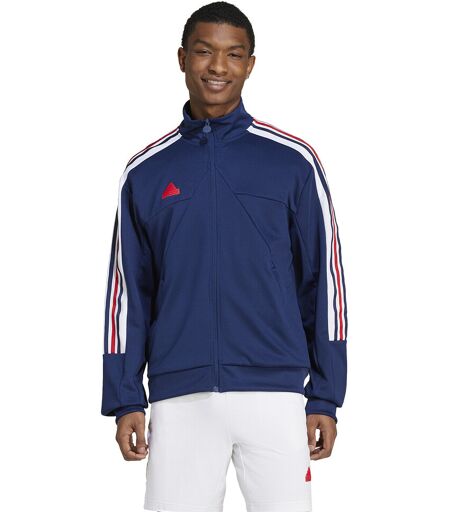 Détails produit Veste de sport Coupe droite Longueur : court Col montant Fermeture : zippée Logo poitrine Bandes tricolores épaules et manches longues 2 poches côtés zippéesComposition et Entretien 70% polyester, 30% coton Pour l'entretien, merci de vous référer aux indications figurant sur l'étiquette du produit ...