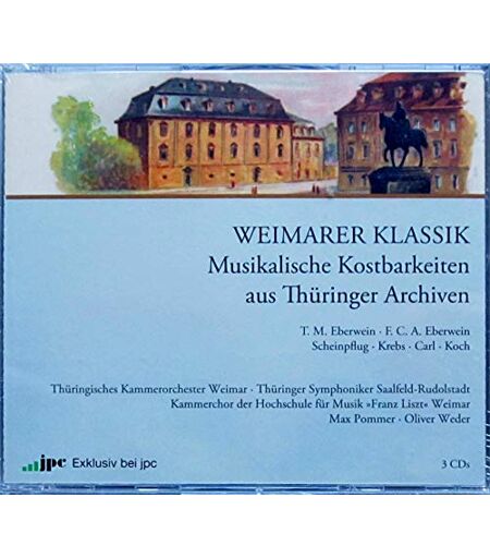 Binding : Audio CD, Label : jpc, Publisher : jpc, NumberOfDiscs : 3, Format : Kompilation, medium : Audio CD, publicationDate : 2016-01-01, artists : Kammerchor der Hochschule für Musik 'Franz Liszt' Weimar, composers : Traugott Maximilian Eberwein, Franz Carl Adalbert Eberwein, Christian Gotthelf Scheinpflug, Johann Ludwig Krebs, Koch, Heinrich Christoph, Christian Wilhelm Carl, conductors : Oliver Weder, Max Pommer, orchestra : Thüringer Symphoniker Saalfeld-Rudolstadt, Thüringisches Kammerorchester Weimar ...