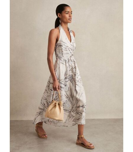 Reiss Reiss Neutral Carla Petite Linen Palm Print Halterneck Midi Dress Neutral