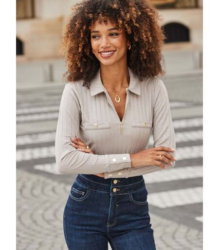 Add it to your everyday line-up, crafted from soft ribbed fabric with just the right amount of stretch, framed by an on-trend half-zip neckline, elevated with luxe gold hardware, chic taupe shade will go with everything, we're styling it with wide-leg trousers and trainers. Model is 5 9 and wears a UK size 8 Lavable en machine. 46% Coton, 45% Polyester, 9% Elasthanne. ...