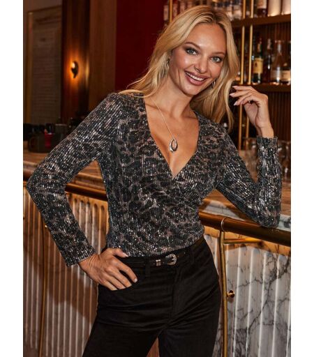 Leopard print sequins? We're obsessed, that wrap front is so flattering, figure-hugging fit - wear it tucked in or out, framed by slim long sleeves, pairs perfectly with denim and leather, slip a sleek blazer on top. Model is 5ft 9'' and wears a UK size 8. Dry clean only. Main 94% Polyester, 6% Elastane. Lining 100% Polyester. ...