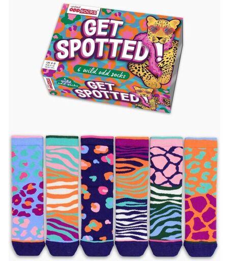 Unleash your wild side with Get Spotted! - 6 wild and fierce animal print Oddsocks that make a statement. Perfect for the bold, these socks bring a playful twist to your wardrobe. Whether you're lounging like a leopard, heading out, or showing off your unique style, these socks will have you feeling unstoppable. Why blend in when you were born to stand out? Get spotted and let your feet roar with confidence! This set contains six socks in UK sizes 4-8. Lavable en machine. 76% Coton, 22% Nylon, 2 ...