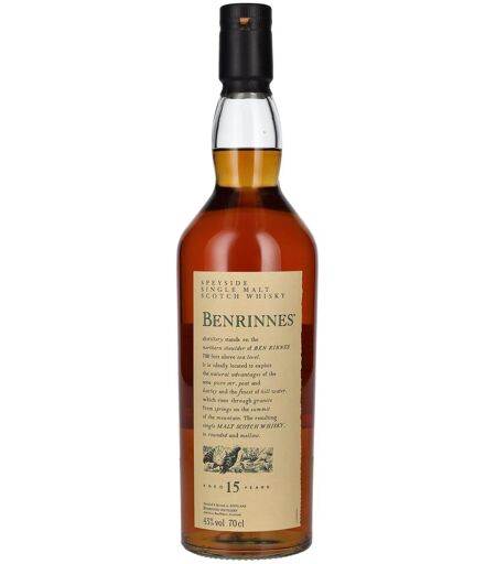 Flora and Fauna, surnom de feu l'écrivain de whisky Michael Jackson, était une série thématique d'embouteillages de whisky single malt commercialisés uniquement par des distilleries. Chaque distillerie a reçu une créature particulière comme symbole, Couleur : acajou brillant. Nez : Riche, floral, légèrement fumé, chocolat, notes d'arômes de sherry, cuir, huile. Goût : Corsé, doux, sucré, semblable au rhum. Finale : Longue durée, sèche, fumée de tourbe, sherry. Le Benrinnes est servi dans u ...
