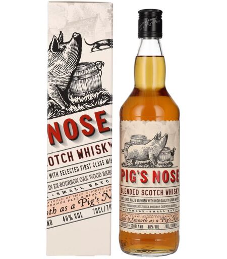 Le Pig's Nose Blended Scotch Whisky est un excellent scotch de 5 ans d'âge, réputé pour son goût particulièrement doux et souple. Ce blended whisky réunit les meilleurs whiskies de malt et de grain des régions écossaises renommées des Lowlands, du Sp Couleur : ambre. Nez : Arômes fruités de pommes, de miel, de vanille et un soupçon de chêne. Goût : Doux et rond avec des notes de caramel, de malt, de fruits secs et une légère douceur vanillée. Finale : longue et douce, avec une légère touche d' ...