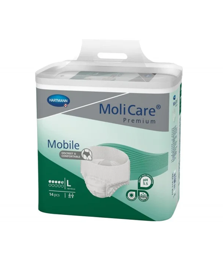 MoliCare® Premium Mobile 5 gouttes est une protection discrète et confortable pensée pour accompagner les personnes souffrant de fuites urinaires modérées. Faciles à enfiler, ces changes mobiles pour adultes s'utilisent comme un sous-vêtement classique, tout en garantissant une excellente absorption et une sécurité renforcée au quotidien. Grâce à son noyau absorbant innovant, ce modèle assure une rétention rapide de l'humidité tout en limitant les odeurs. Sa conception à pH neutre (environ 5,5) respecte l'équilibre naturel de la peau. La structure fine et souple des slips absorbants pour adultes les rend discrets sous les vêtements et confortables à porter, même en mouvement. La matière extérieure, douce et respirante, permet une bonne aération de la peau, contribuant ainsi à prévenir les irritations. Pour une manipulation simple, les coutures latérales peuvent être facilement déchirées. Ces culottes d'incontinence pour adultes sont idéales pour les personnes actives ou en perte d'autonomie légère souhaitant conserver leur liberté de mouvement. Caractéristiques principales : Triple couche absorbante : contrôle l'humidité, les odeurs et prévient les fuites Design ergonomique : suit les formes du corps pour un maintien optimal Tissu aéré : laisse la peau respirer naturellement Technologie d'absorption rapide : sensation de fraîcheur prolongée Ouverture latérale facile : pour un retrait rapide et hygiénique Indicateur d'humidité intégré : aide à déterminer le bon moment pour changer Testé dermatologiquement : tolérance optimale pour les peaux sensibles Pour celles et ceux à la recherche de changes mobiles pour adultes à la fois efficaces, discrets et confortables, MoliCare® 5 gouttes est une solution fiable qui s'adapte à votre rythme de vie. Guide des tailles et absorption : Tour de hanches Absorption HARTMANN MOLICARE MOBILE 5 GOUTTES SMALL 60 à 90 cm 941 ml HARTMANN MOLICARE MOBILE 5 GOUTTES MEDIUM 80 à 120 cm 1017 ml HARTMANN MOLICARE MOBILE 5 GOUTTES LARGE 100 à 150 cm 1198 ml HARTMANN MOLICARE MOBILE 5 GOUTTES XL 130 à 170 cm 1183 ml Autres absorptions disponibles dans la gamme Hartmann MoliCare Mobile : MoliCare Premium Mobile 6 gouttes Tour de hanches Absorption EXTRA SMALL 45 à 70 cm 1361 ml SMALL 60 à 90 cm 1475 ml MEDIUM 80 à 120 cm 1662 ml LARGE 100 à 150 cm 1963 ml EXTRA LARGE 130 à 170 cm 2140 ml MoliCare Premium Mobile 8 gouttes Tour de hanches Absorption SMALL 60 à 90 cm 1791 ml MEDIUM 80 à 120 cm 2015 ml LARGE 100 à 150 cm 2279 ml EXTRA LARGE 130 à 170 cm 2421 ml MoliCare Premium Mobile 10 gouttes Tour de hanches Absorption MEDIUM 80 à 120 cm 2626 ml LARGE 100 à 150 cm 2631 ml EXTRA LARGE 130 à 170 cm 2757 ml Adoptez les MoliCare Mobile 5 gouttes pour une journée active en toute sérénité. Commandez maintenant sur Senup.be et profitez d'une protection fiable au meilleur prix ! ...