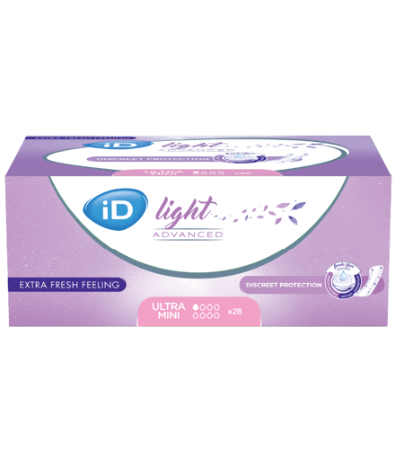 ID Light Ultra Mini Protège-slip ultra discret pour les fuites urinaires légères. • Protection anatomique mince et confortable. • Voile externe avec camomille pour apaiser les peaux sensibles. • Noyau super absorbant drainant rapidement l'urine. • Avec bande adhésive pour un meilleur mantien dans le sous-vêtement. ID Light Longueur Absorption Conditionnement Ultra Mini 190 mm 100 ml 28 protections Mini 227 mm 170 ml 20 protections Mini Plus 257 mm 260 ml 16 protections Normal 280 mm 330 ml 12 protections Extra 350 mm 530 ml 10 protections Maxi 405 mm 800 ml 10 protections ...