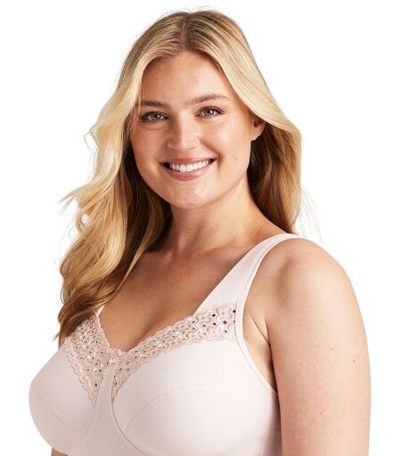 Broderie Anglaise non-wired bra is a modern cotton bra classic and constant favourite year after year. Unpadded and unlined full cup with two-section cut decorated with broderie anglaise gives the bust a naturally pointed shape. Provides soft support and lift also in big sizes right up to an I cup! Padded, adjustable comfort shoulder straps provide long-lasting comfort. Elastic U-shaped back with adjustable hook and eye fastening. Lavable en machine. 83% Coton, 10% Elasthanne, 7% Nylon. ...